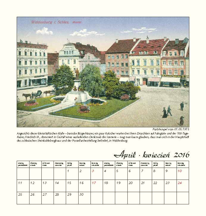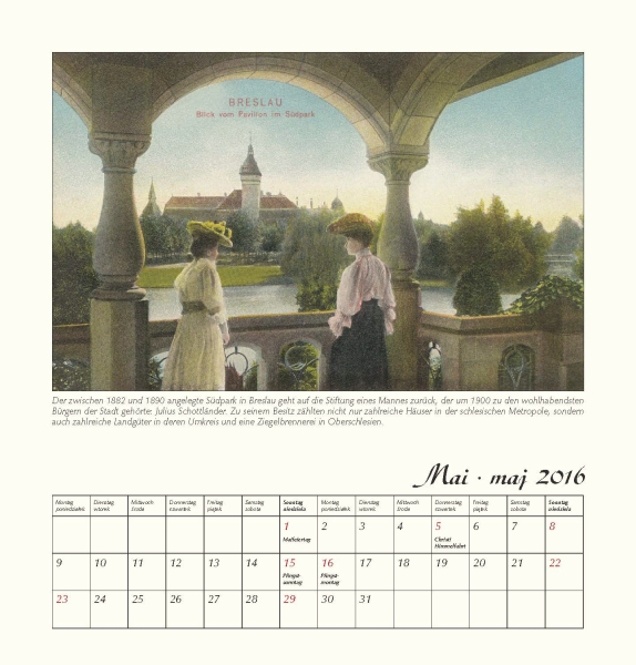 Sorgsam retuschiert, sind die antiquarischen Postkarten auf edlem Elfenbeinkarton gedruckt. Zu allen Monatsbildern gibt es einen kurzen informativen Text. Das dezent gestaltete Kalendarium in polnischer und deutscher Sprache bietet ausreichend Platz für kleine Vermerke.